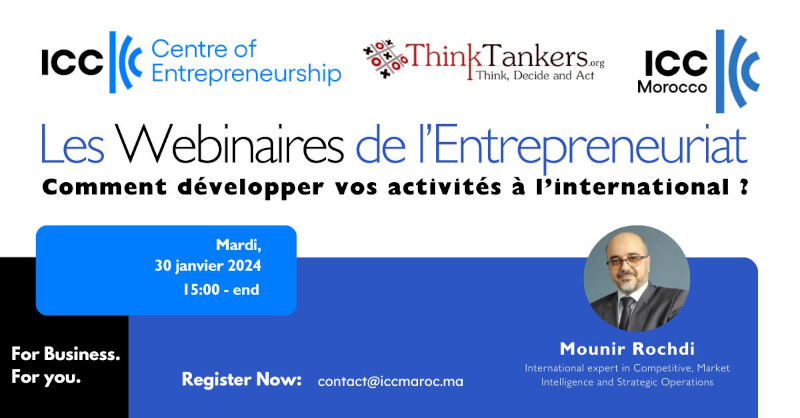 L’International Chamber of Commerce (ICC Maroc), dans le cadre de son "Centre of Entrepreneurship", organise une série de Webinaires de l’entrepreneuriat en 2024. Son premier, organisé en partenariat avec ThinkTankers, porte sur le thème : Comment développer vos activités à l’international ?